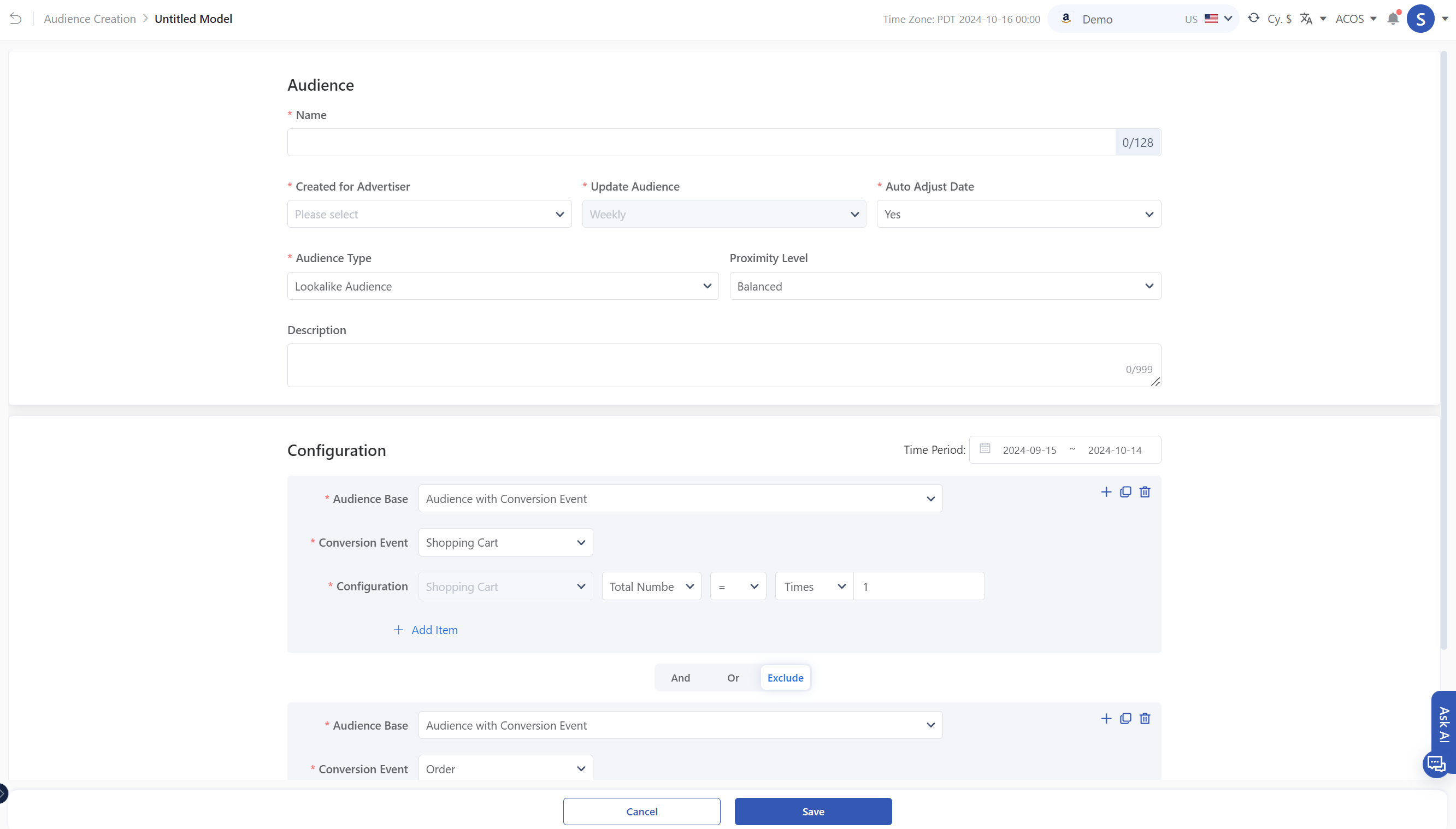 以下は、視聴者の特定のルール設定ページです。 AMCカスタムオーディエンスは、(交差、組合、除外)の関係に応じて、異なる行動または特性を持つ視聴者条件グループの組み合わせを構成することで完了できます。これらの条件グループの構成と関連関係を満たすユーザーは、カスタムオーディエンスを作成するためにキャプチャされます。