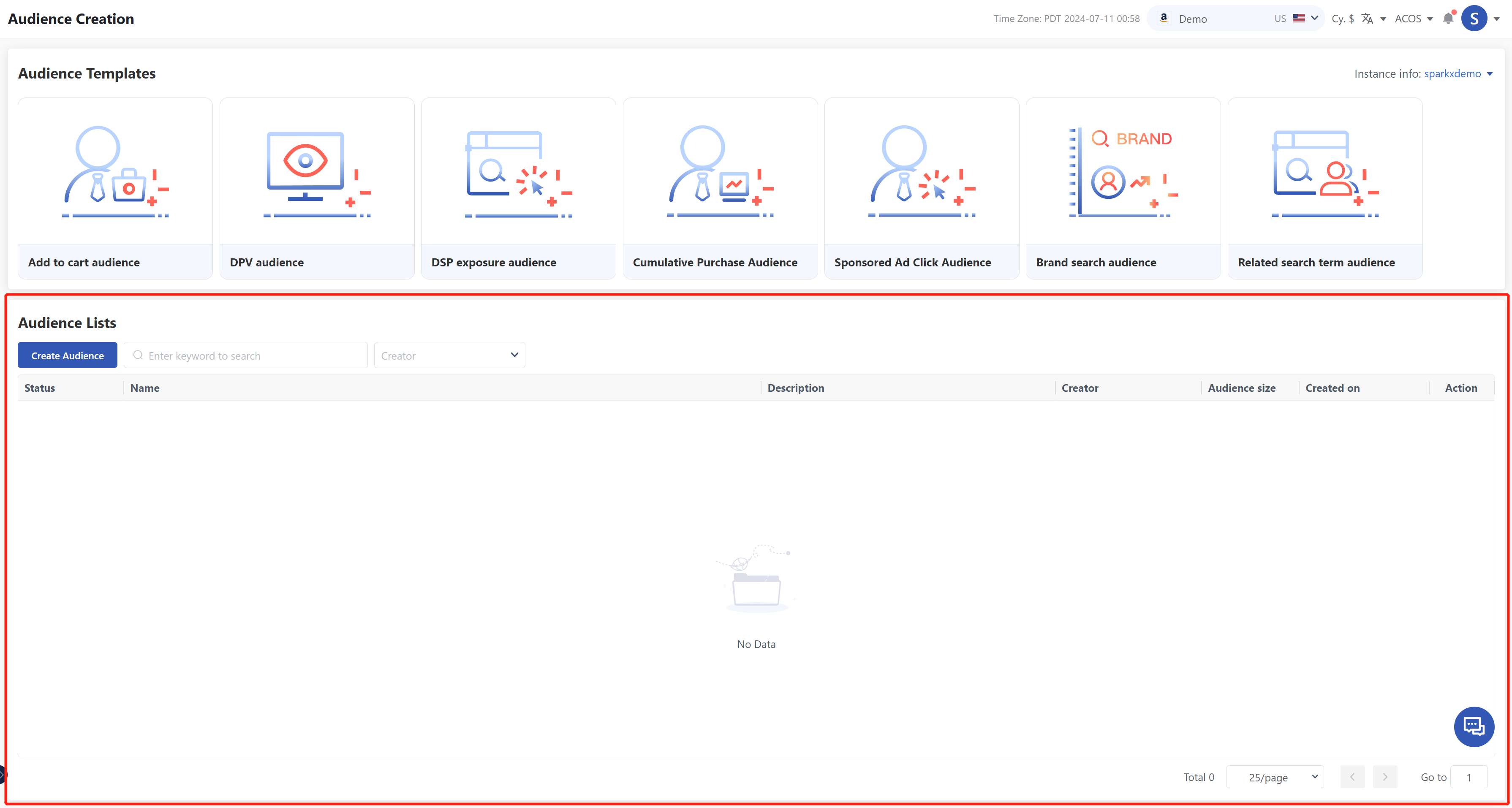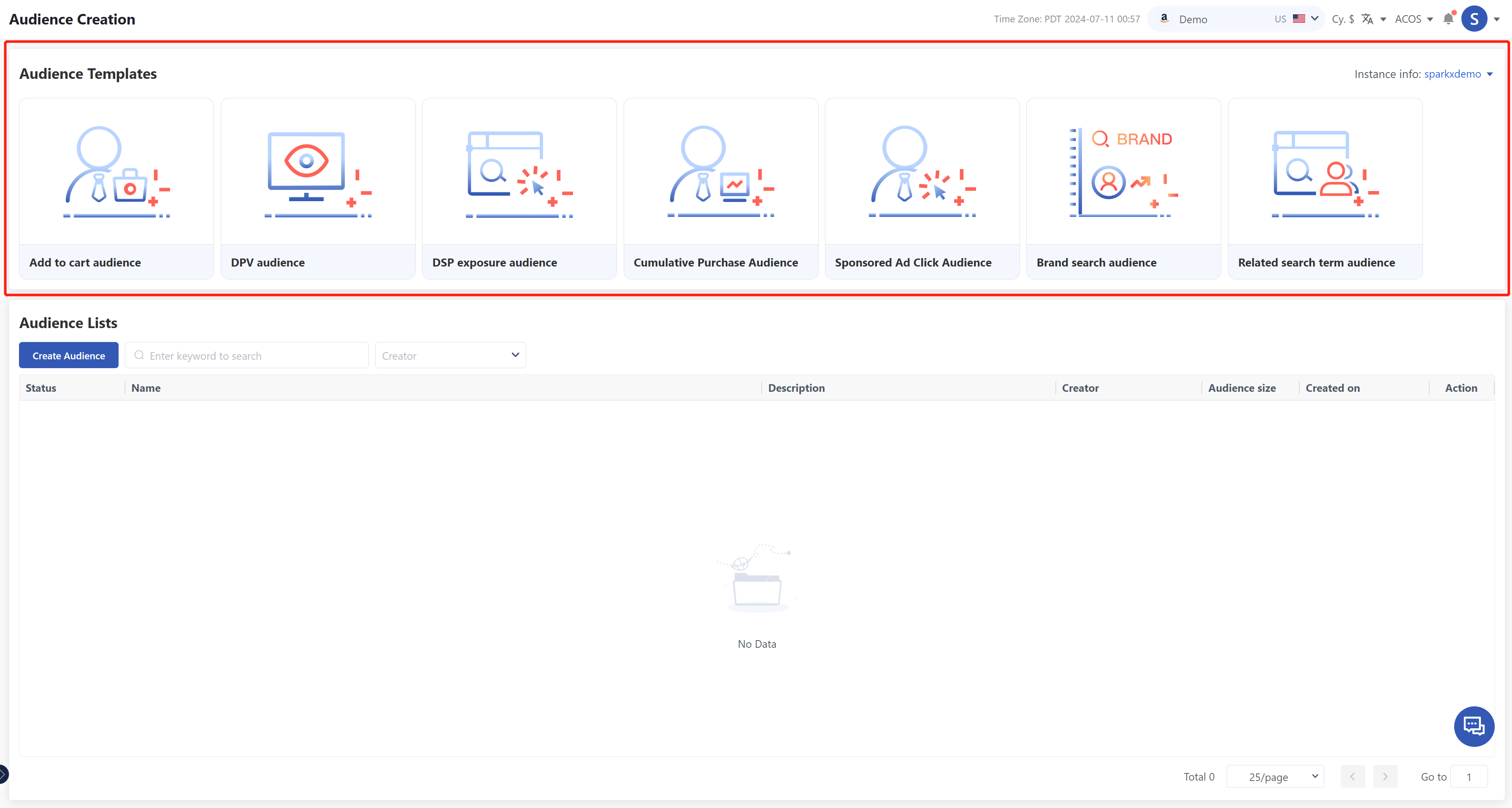 AMCオーディエンス作成機能は現在、DSP広告データを含むAMCインスタンスでのみサポートされています。この機能を使用するには、AMCインスタンスが少なくとも1つのDSP Advertiserアカウントに正常に関連付けられていることを確認してください。 DSP広告主を関連付ける特定の手順については、基本的な紹介と承認管理の承認セクションを参照してください。