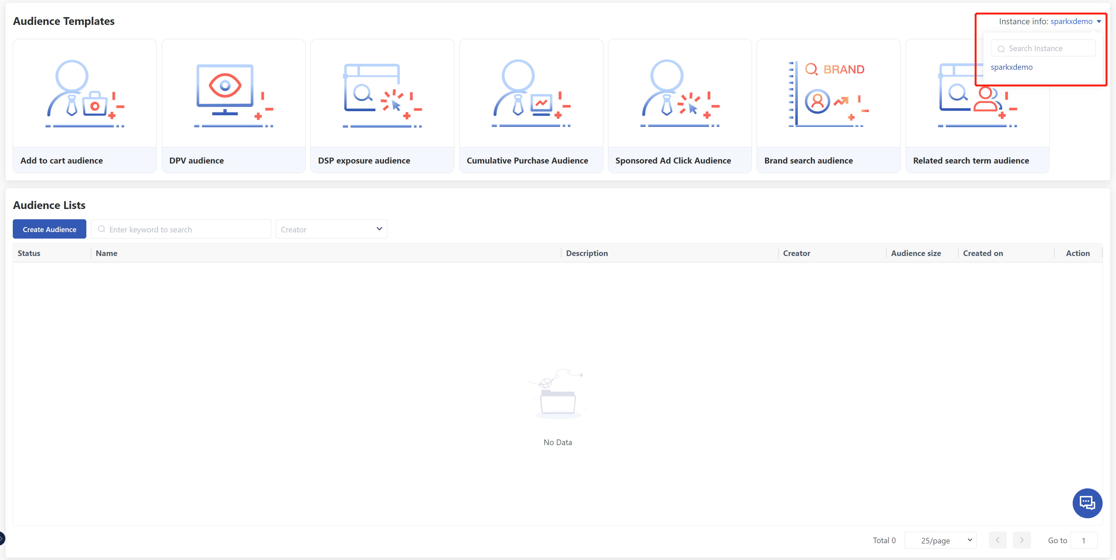リスト内の作成には、コピーと削除の2つの操作が許可されています。 deleteをクリックした後、聴衆のレコードはリストから削除されますが、DSP/SAコンソールにプッシュされた視聴者自体は削除されません。 [コピー]をクリックすると、視聴者のカスタマイズ構成ページを入力し、選択したコピーされたオーディエンスの特定の構成を導入します。この関数は、視聴者の作成が失敗した後に再試行するためにも使用できます。